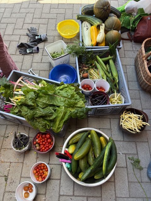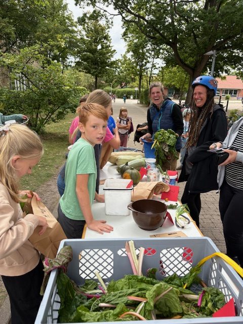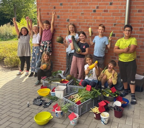 Bei bestem Erntewetter mit 20 ° C und viel Sonne sowie der vereinten Hilfe von Acker-Buddys (Eltern), Frau Wenk, Frau Inderbieten und den tatkräftigen Schüler*innen aus der Klasse 4c und der SchulAcker-AG wurde am Donnerstag, 21.08.25 innerhalb kürzester Zeit das Gemüse geerntet.